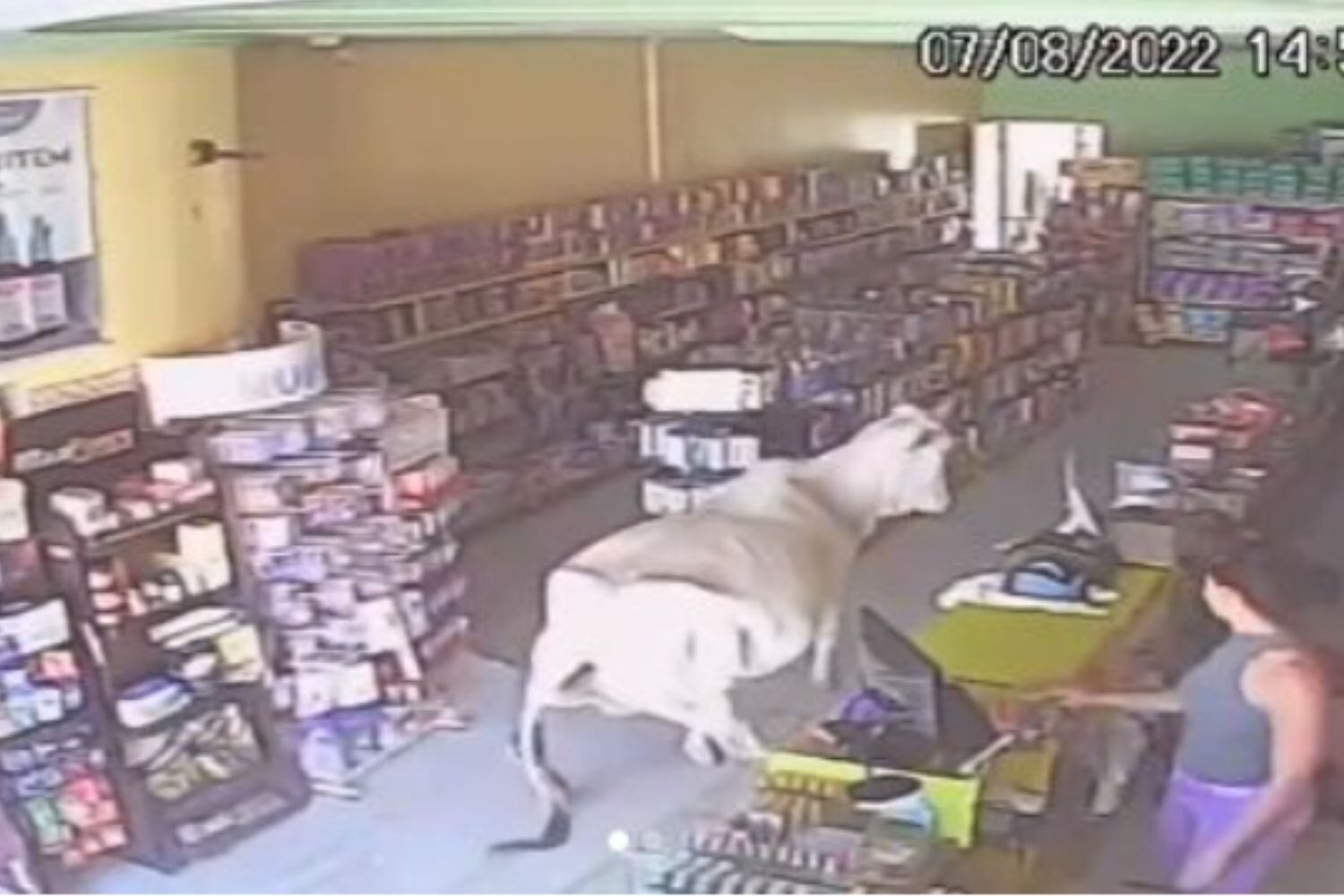 O caso aconteceu no último dia 7 na farmácia que fica na Avenida Major Claro, no centro da cidade. As imagens registraram quando a vaca entrou no local depois que um rebanho passou pela rua. Ela escorregou e ficou caída do chão por alguns minutos.