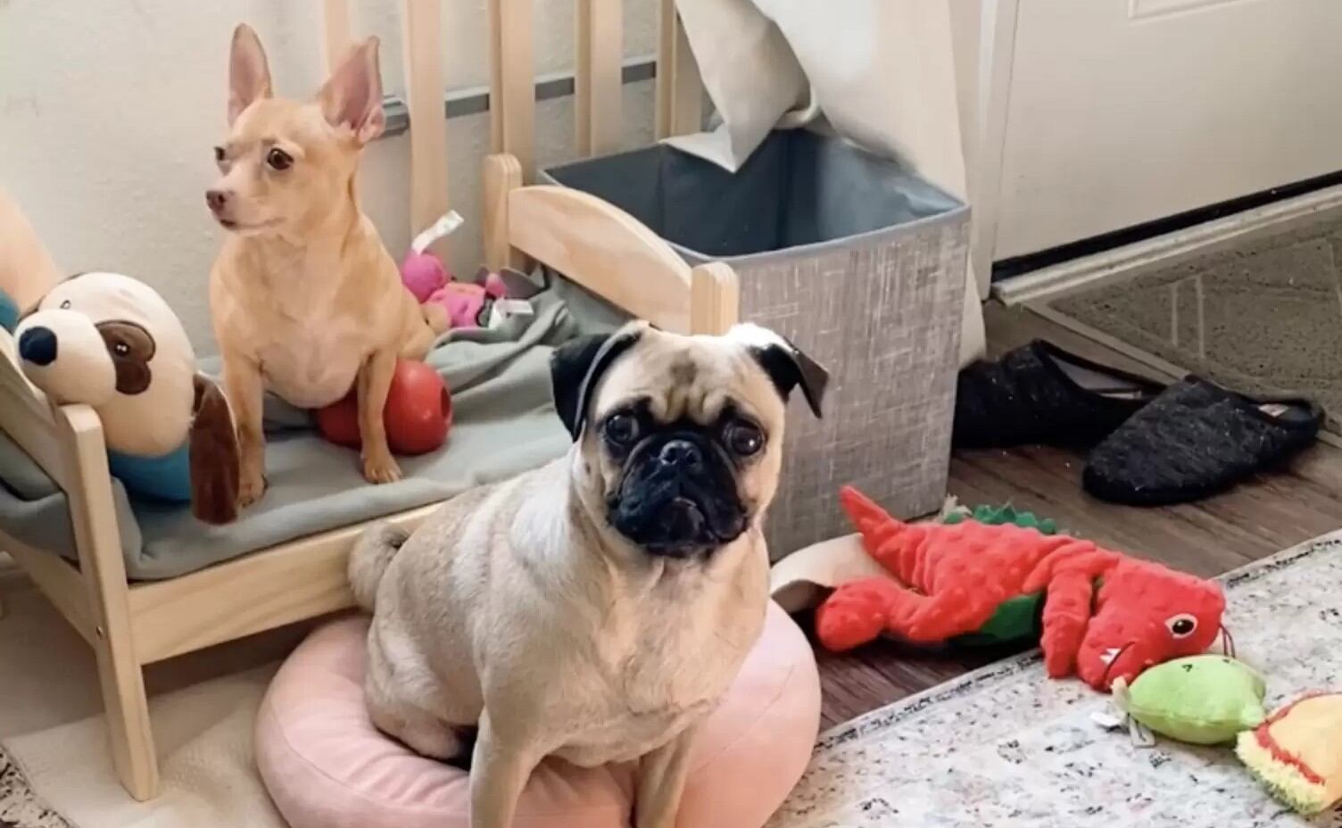 Após perceber que trabalhava demais, Elle Nailga estava preocupada que sua cadela, Bella, ficasse muito solitária. Pensando nisso, ela acolheu um cãozinho pug chamado Baguette em sua família. Contudo, não contava com a astúcia de Bella. Relato extraído do portal The Dodo.