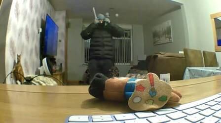 Um ladrão mascarado e armado com uma faca invadiu uma casa em Chadderton, na Grande Manchester, na Inglaterra, e se deparou com o morador dormindo tranquilamente na sala. A câmera de um computador flagrou o momento.