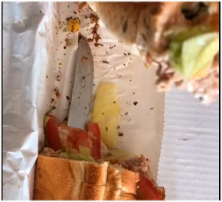 Nerice Moyse mora na cidade de Lowestoft, está grávida de 4 meses, e estava com muita vontade de comer um dos sanduíches da rede Subway de atum, seu preferido, mas quando sentou na mesa para comer descobriu que dentro do lanche tinha uma faca misturada ao recheio.