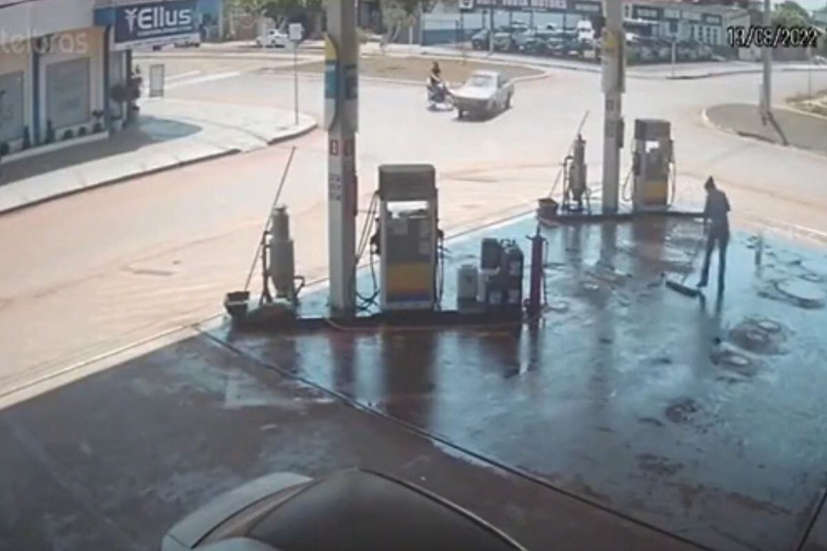 A moto fica caída no chão, e o carro para na esquina. Em seguida, funcionários do posto se aproximam para ver o que tinha acabado de acontecer.