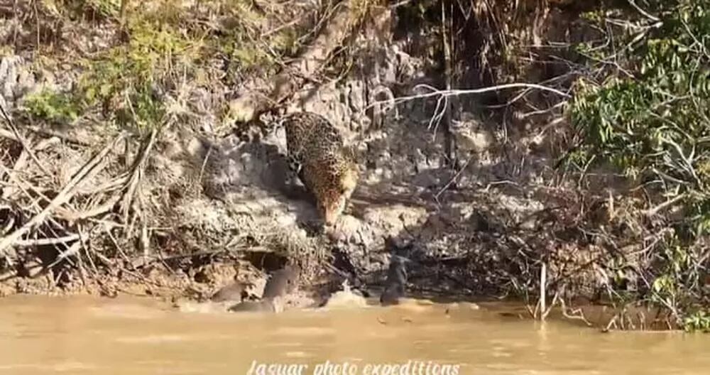 No vídeo, que se tornou viral nas redes, a onça caminha à margem esquerda do rio, enquanto um grupo de ariranhas tomava banho de sol.