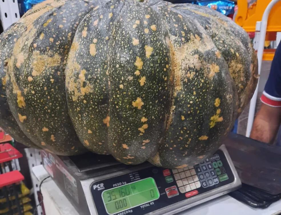 Uma agricultora colheu uma abóbora gigante no Sítio Olho D’água, em Limoeiro, no Agreste de Pernambuco, no último sábado (20). O fruto, que pesa 35,16 quilos, impressionou.