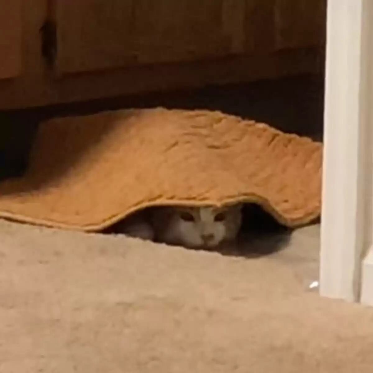 Embora o animalzinho seja adepto ao esconderijo no tapete de banho, Pumpkim se aninha sob quase tudo o que encontra pelo chão – mesmo nem sempre estando tão escondido quanto imagina.