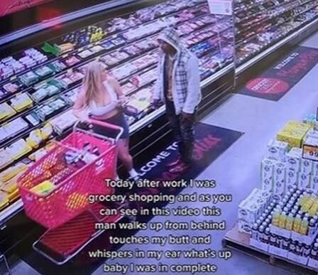 “Hoje, depois do trabalho, eu estava fazendo compras e como você pode ver neste vídeo, esse homem se aproxima por trás, apalpa a minha bunda e sussurra no meu ouvido ‘E aí baby?’”, comentou Daisy, que trabalha em uma plataforma erótica. “Eu fiquei em choque completo. Por favor, tomem cuidado com o ambiente ao seu redor. Eu não conhecia esse homem e ele tentou disfarçar o que fez”, completou.