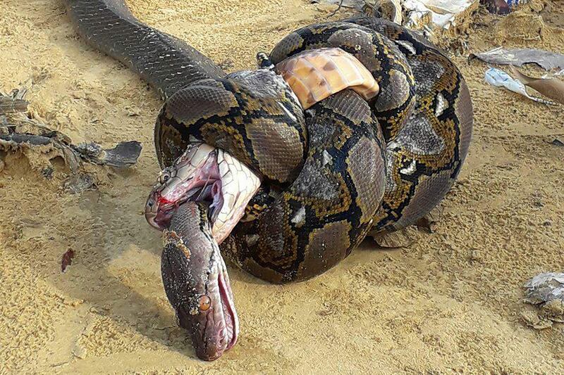 Em 2018, a luta mortal entre uma cobra-rei e uma píton gigante foi fotografada e se tornou notícia. A foto, que provavelmente tirada no Sudeste Asiático, mostrou como ambos animais terminaram mortos após uma disputa, segundo a National Geographic.