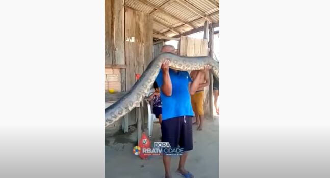 No vídeo, é possível ver como a cobra é levantada por três pessoas que mostram o comprimento do animal na área exterior de uma casa.