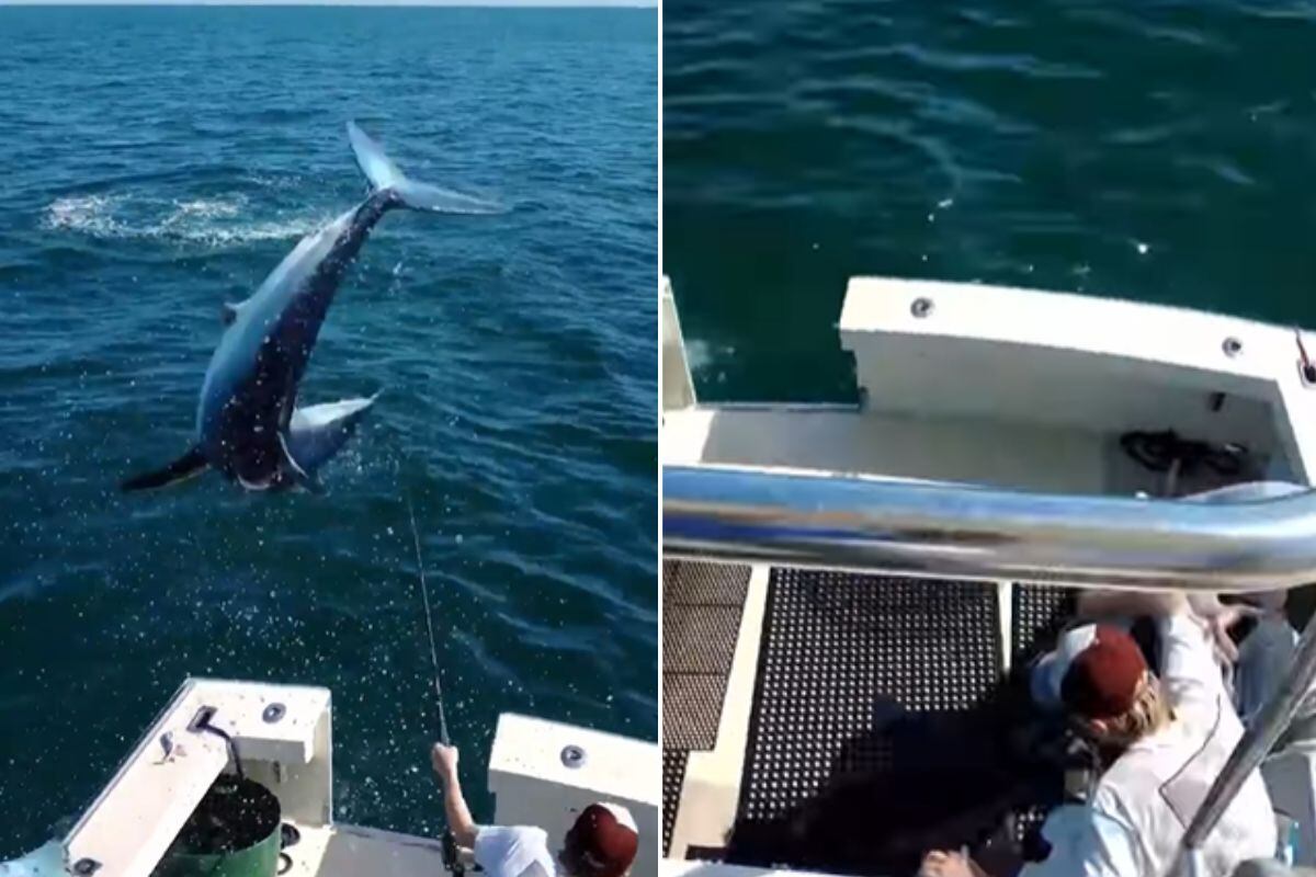 É possível ver que um dos pescadores lutava para trazer um peixe fisgado para a embarcação. Neste momento, porém, o tubarão saltou bem alto e pousou com tudo no deck.