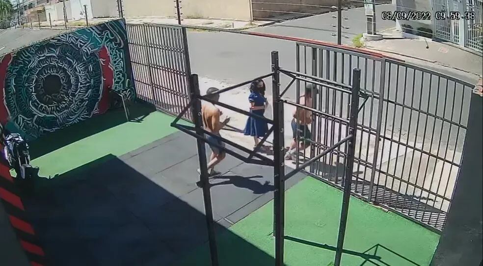 Na gravação, a mulher aparece na calçada, bem em frente à porta do estabelecimento. Dois alunos saem correndo para realizar o treino externo e, prontamente, e senhora os segue.