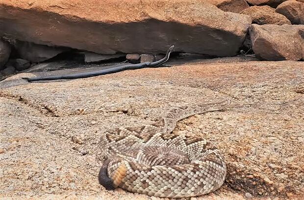 As imagens mostram como uma cascavel fica a frente a frente com uma cobra muçurana, também conhecida como Boiruna, uma espécie que não é peçonhenta, mas se alimenta de outras cobras perigosas, pois é imune ao veneno delas.