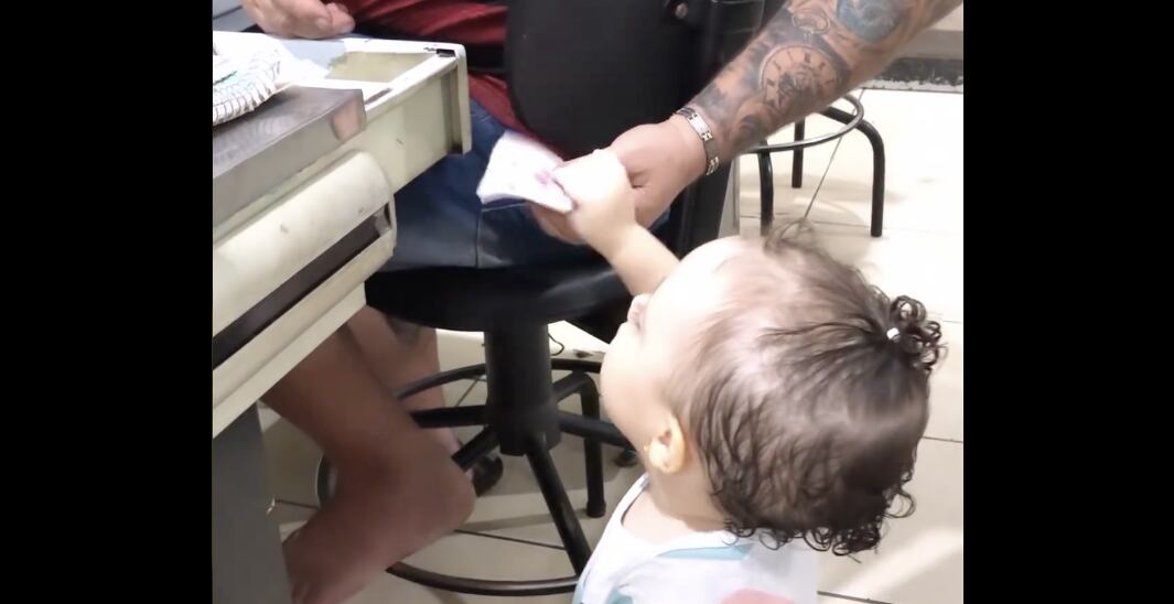 Lavínia Souza Cândido é de Goiânia e chegou até o pai para pedir dinheiro. Ela pergunta “cadê dinheiro?” e ele, sem poder recusar a fofura da própria filha, resolve enganá-la com um pedaço de papel sem valor.