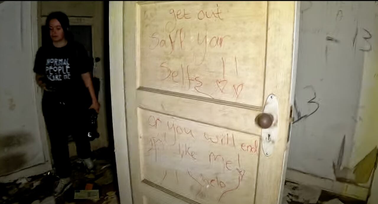 Depois, Daniel então entrou no que ele descreveu como a “sala paranormal”, a maior sala da casa. Na porta, Daniel viu a frase “saia, salve-se ou você vai acabar como eu”. Ele então mostra o canto da sala e onde o número 13 está escrito em toda a parede.