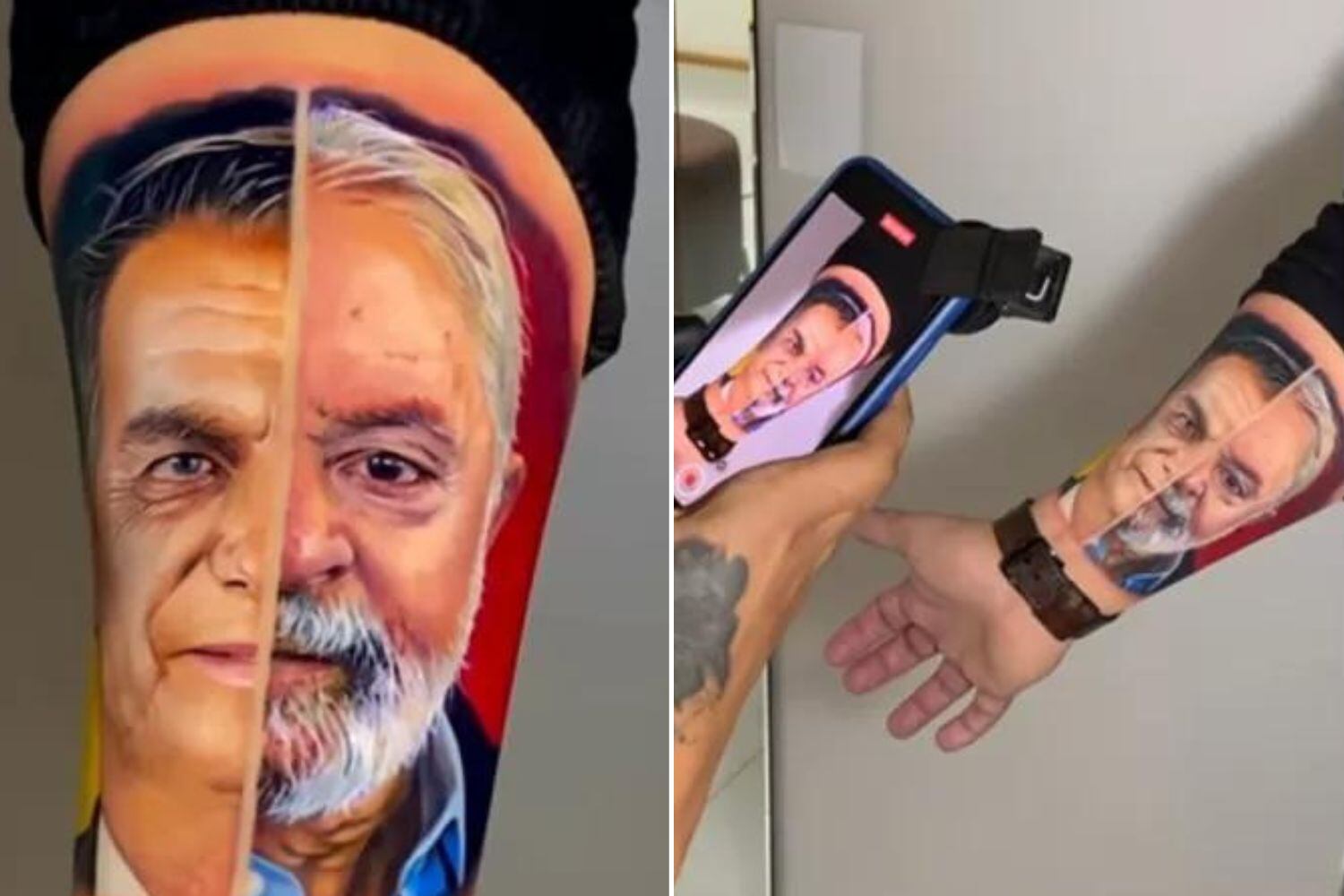 Um homem decidiu “inovar” e fez uma tatuagem com os rostos do presidente Jair Bolsonaro (PL) e do ex-presidente Luiz Inácio Lula da Silva (PT), adversários nas eleições presidenciais deste ano. A homenagem foi feita em um estúdio na Zona Leste de São Paulo, no último dia 15, após mais de 11 horas de sessão (veja abaixo).