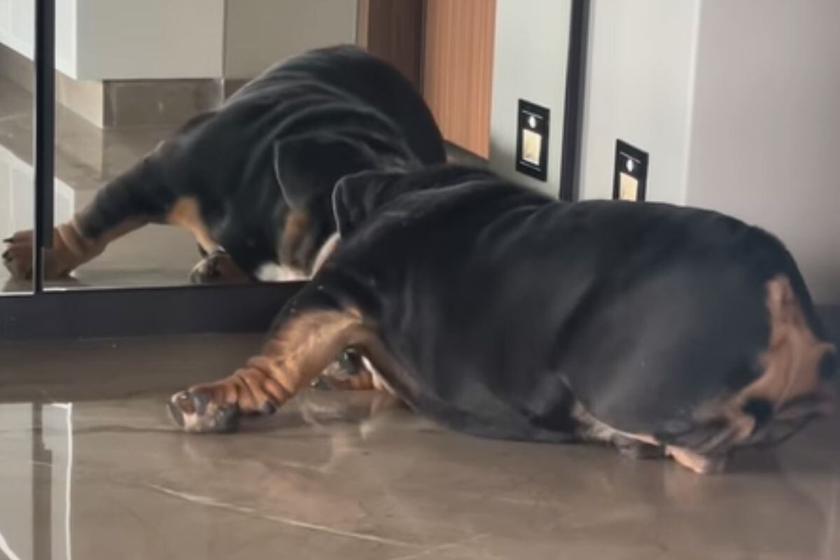 Uma mulher diz ao fundo: “Ele está olhando para seu reflexo e está latindo para o cachorro. Ele está batendo no espelho. Ele não consegue descobrir o que diabos está acontecendo”.
