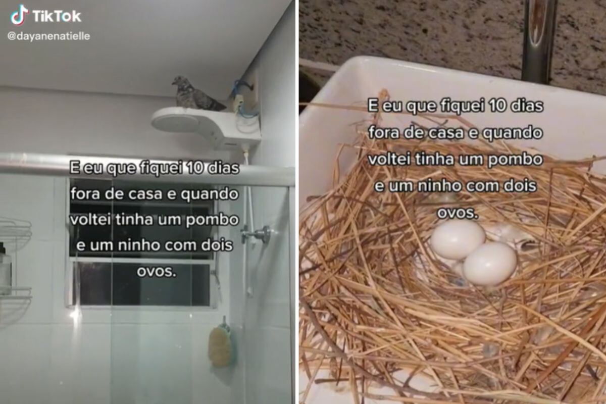 O vídeo foi publicado na rede social no último dia 7 de setembro. Nas imagens, é possível ver uma pomba em cima do chuveiro e um ninho montado na pia, com os dois ovinhos. Como se não bastasse, o chão está uma bagunça, repleto de folhagem e sujeira.