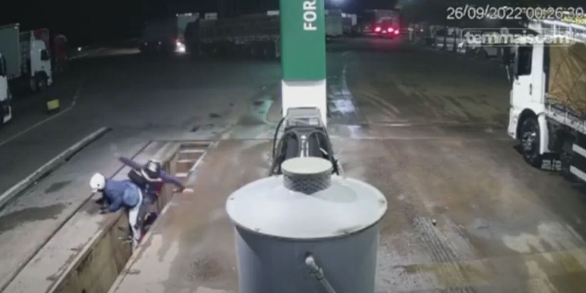 Dois ladrões assaltaram um posto de gasolina e, na fuga, caíram em um buraco usado para a troca de óleo de veículos. Câmeras de segurança flagraram o momento.