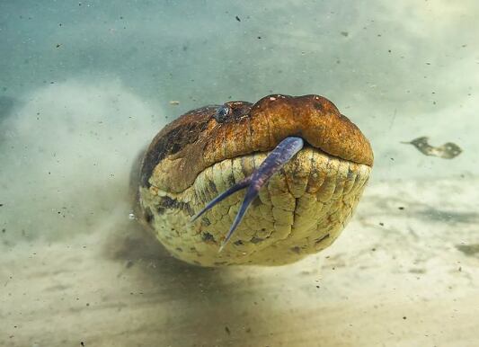 “Uma anaconda verde macho deslizando em minha direção no leito arenoso do Rio Formoso. Nossa viagem foi no início da temporada de acasalamento da anaconda, então muitos machos estavam procurando por uma fêmea enorme para acasalar. As fêmeas acasalam com até 15 machos ou mais ao mesmo tempo e os azarados são comidos pela fêmea no final”, contou em seu Instagram ao publicar um dos cliques.