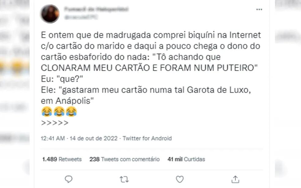 “Comprei biquíni na internet com o cartão do meu marido e daqui a pouco chega o dono do cartão esbaforido do nada: ‘Estou achando que clonaram meu cartão e foram em um puteiro. Gastaram meu cartão numa tal de Garota de Luxo, em Anápolis’”, escreveu a servidora pública Ked Souza, que mora no Rio de Janeiro.