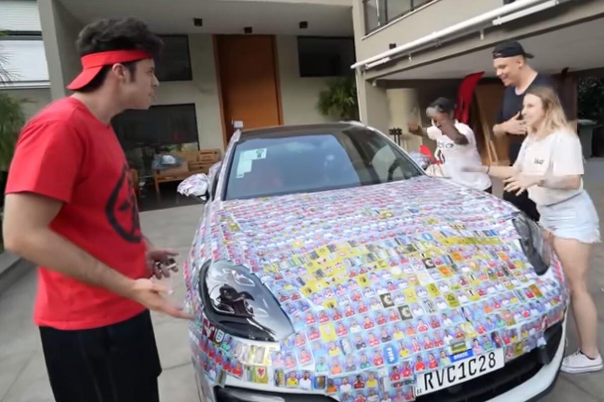 O influenciador digitar e youtuber Enaldinho foi trollado pelos amigos ao ter sua Porsche totalmente adesivada com figurinhas da Copa do Mundo.