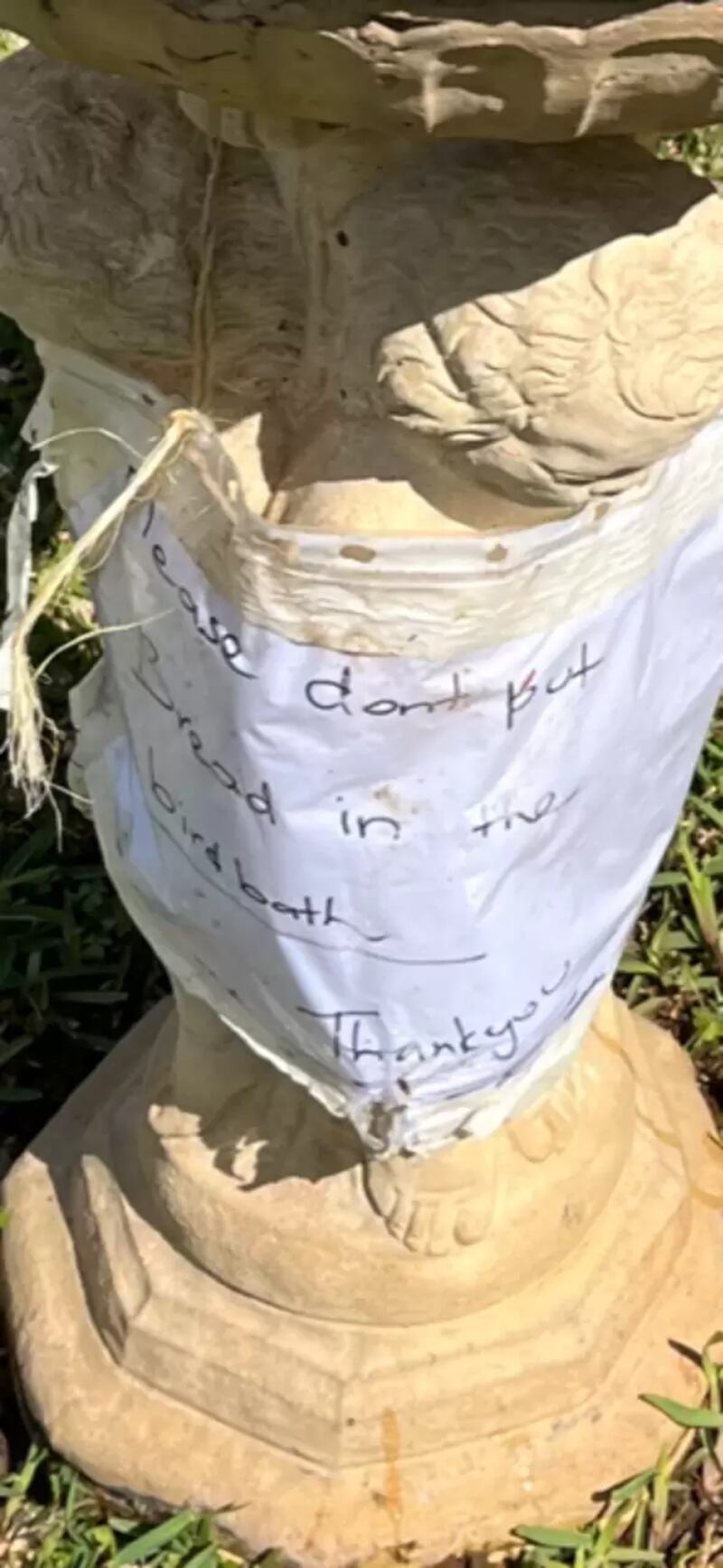 A mulher percebeu certa frequência na aparição dos pães na fonte. Embora admirasse o esforço de alguém alimentar os pássaros, não gostava de limpar o banho de pássaros todos os dias.