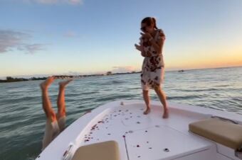 No registro, é possível ver o momento em que o casal aproveita um belo pôr do sol a bordo de um barco no meio do mar. Com o local devidamente enfeitado e o cenário perfeito de fundo, o homem se ajoelha enquanto retira do bolso a caixa contendo o anel de noivado para pedir a amada em casamento.