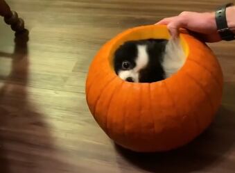 “Huxley decidiu imediatamente que esta abóbora era sua nova casa e ninguém poderia dizer o contrário”, escreveu Chen no TikTok.