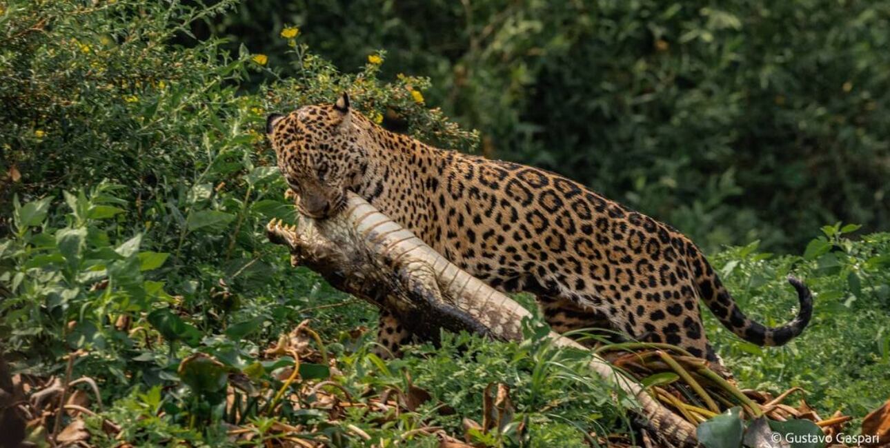 “Foi emocionante demais ver a Patrícia (onça-pintada com dois filhotes) buscando incansavelmente um tira gosto pra molecada!Ela conseguiu pegar esse jacaré a uns 4 metros do nosso barco e o mais foda de tudo é que nem houve luta direito, ela apenas entrou na vegetação ma beira do rio e saiu carregando esse réptil gigante, o jacaré-do-pantanal (Caiman yacare).