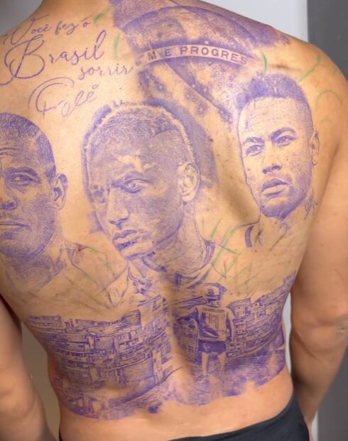 Para isso, Richarlison fechou as costas com uma arte contendo seu próprio rosto cercado pelo retrato de Ronaldo Fenômeno e Neymar Jr, além de um autógrafo do rei Pelé.