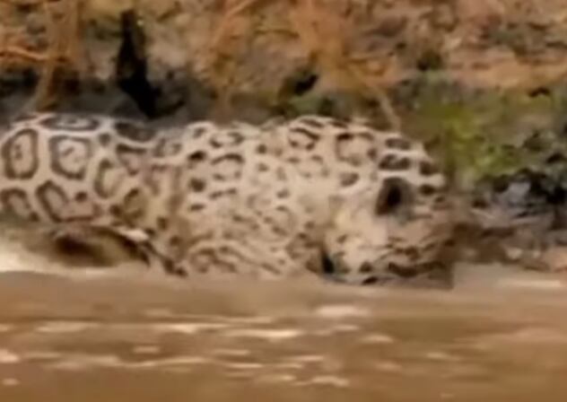 No registro, é possível ver o animal atacando e capturando a presa em um rio. Logo depois, a onça acaba arrastando o jacaré para a margem, aparentemente sem muito esforço.