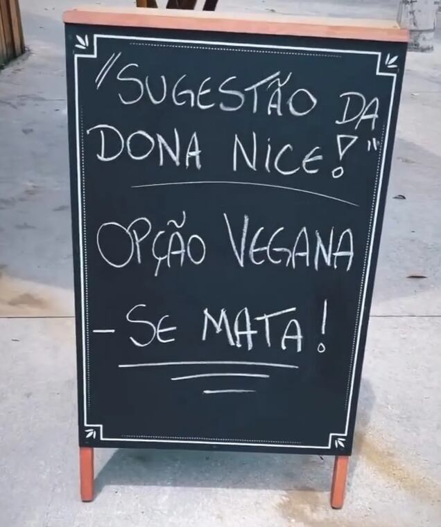 No informativo, que geralmente é utilizado para apresentar aos clientes o prato do dia, é possível ler a mensagem na voz da personagem fictícia criada para ser a “imagem” do restaurante: “Sugestão da Dona Nice! Opção vegana: se mata!”.