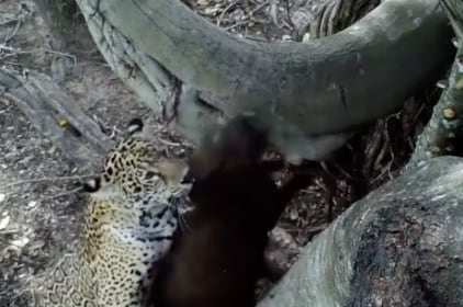 Uma sequência impressiona ao mostrar o esforço de uma onça-pintada para subir com um presa em uma árvore no Pantanal.