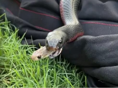 De acordo com o Yahoo News, uma cobra-negra-de-barriga-vermelha foi encontrada por Mitch Thorburn, da companhia de resgate de repteis South East Reptile Relocations, se aproximou da cobra e percebeu que ela havia comido recentemente.