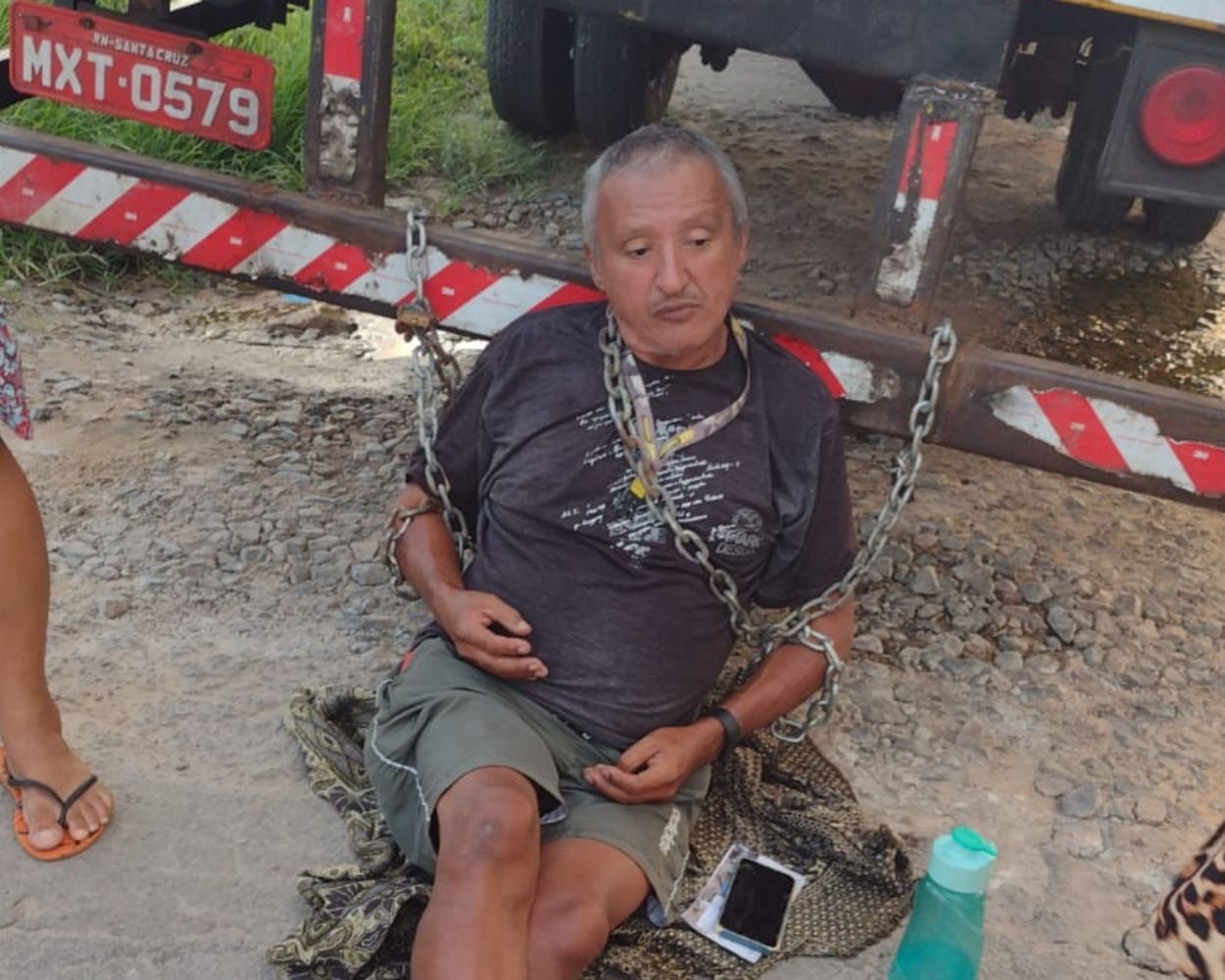 Um caminhoneiro decidiu se acorrentar em caminhão como forma de protesto nas ruas de São Gonçalo do Amarante, munícipio de Natal, Rio Grande do Norte. O homem reivindicava conversar com o prefeito local sobre a situação das estradas e os buracos localizados em Cidade Jardim.
