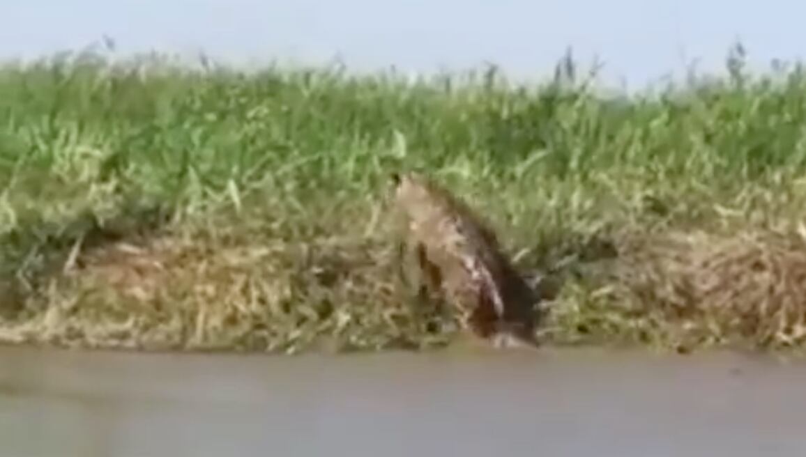 Um registro impressiona ao flagrar o momento em que uma onça-pintada tenta capturar um jacaré com um ‘super ataque’ no Pantanal