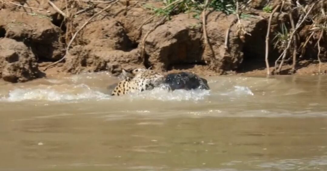 Sem chance de defesa, um novo vídeo flagrou o momento em que uma onça-pintada captura um jacaré no Pantanal.