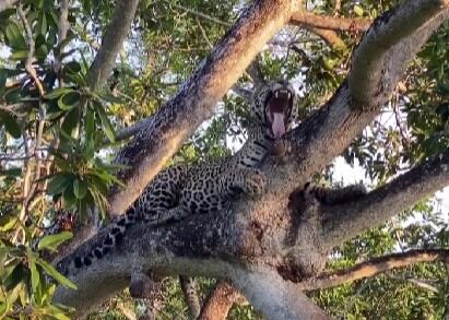 Registro impressiona ao flagrar equilíbrio de onça-pintada destemida em árvore no Pantanal
