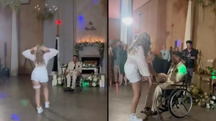 Maynard é vista realizando diversos passos atrevidos, enquanto os convidados são ouvidos animados e o marido assiste tudo da sua cadeira de rodas.