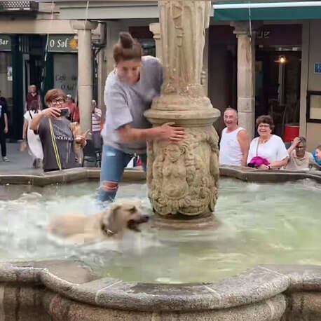 Ainda que a cena fosse fofa demais, adentrar a fonte é algo proibido. Então Anina fez de tudo para convencer sua cachorrinha a deixar o local. Ao ver que não tinha jeito, ela mesma resolveu entrar na água e remove’u seu cãozinho de lá.