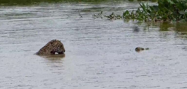 “Onça atravessando o rio, quando encontra o tronco imaginando ser uma presa. Talvez um jacaré“, marcou na postagem.