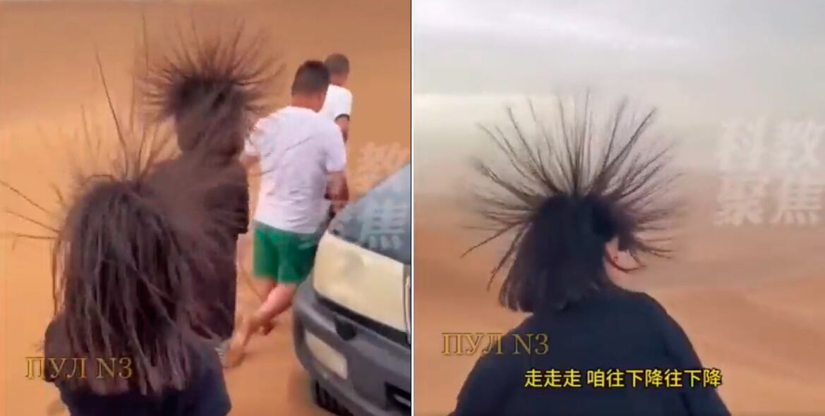 Um grupo de turistas gravou um vídeo enquanto se divertia no deserto de Kumtang, na região autônoma Uigur de Xinjiang, logo após uma rápida chuva, principalmente por um detalhe incomum: todos ficaram com os cabelos arrepiados, segundo notícia do The Sun.