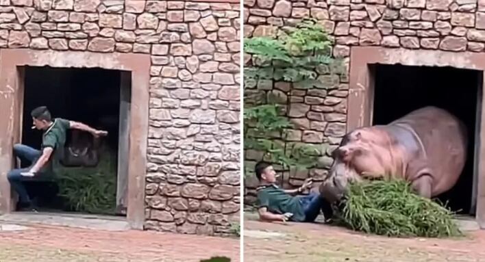 As imagens de câmera do Zoológico Ecológico de Changsha, na província chinesa de Hunan, flagram o momento em que o tratador escorrega e o hipopótamo surge carregando na boca uma pilha de plantas, que deixa no chão para poder abrir a boca na direção ao homem.