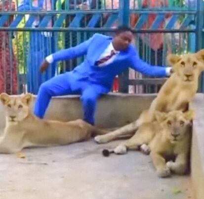 Na gravação, é possível ver como ele chega a acariciar uma das leoas enquanto está na jaula e as outras pessoas o assistem de fora.