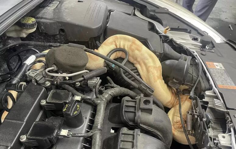 Ao abrir o capô do carro, os técnicos da oficina se depararam com um uma cobra dentro do compartimento do motor. Se tratava de uma jiboia albina de 2,5 metros de comprimento.