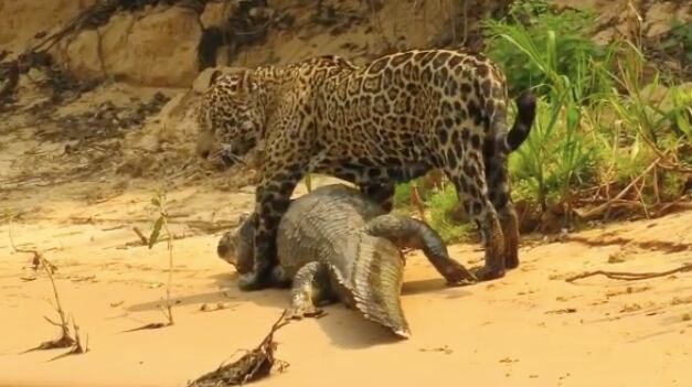 Em outro momento impressionante, um novo registro flagrou o momento em que uma onça captura um jacaré com um ataque mortal.