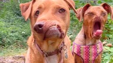 Picasso, um mestiço de 7 anos, foi resgatado em 2017 por Liesl Wilhardt, fundadora do Luvable Dog Rescue. Sua deformidade, conhecida como boca torcedora, não o impede de viver uma vida plena. Ao mesmo tempo, Newt, um cão corajoso de três anos, perdeu a parte superior do focinho em um trágico acidente, quando sua mãe o mordeu ao nascer.