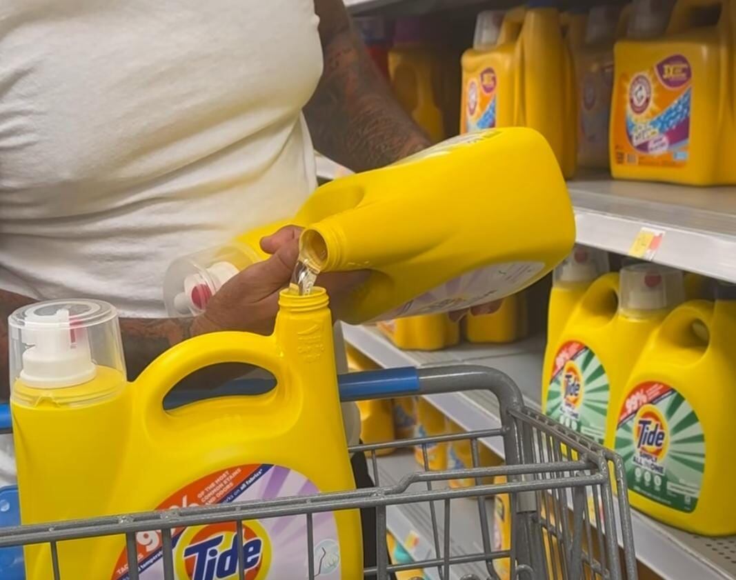 No vídeo, um homem aparece abrindo outra embalagem de sabão para completar o produto que ele estava comprando. O objetivo era levar o produto totalmente cheio.