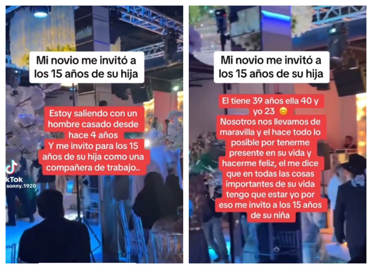 Uma internauta identificada como @sonny.1920 compartilhou um vídeo no TikTok com a descrição: "Meu namorado me convidou para os 15 anos de sua filha", onde afirma que está saindo com um homem casado há quatro anos. A mulher revelou que seu amante a convidou para celebrar o aniversário de 15 anos de sua filha e aceitou acompanhá-lo "como uma colega de trabalho" porque "ele é quem deve respeito a ela".
