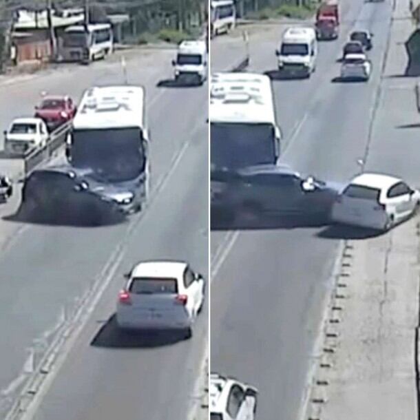 De acordo com as imagens captadas por uma câmera de segurança, ao entrar na avenida principal, o carro dos criminosos foi violentamente atingido por um ônibus. Posteriormente, devido ao impacto, colidiram com outro carro.