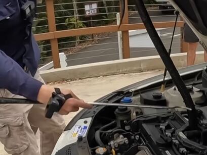 Um vídeo flagrou o impressionante momento em que uma cobra venenosa é capturada em um motor de um veículo.