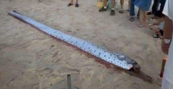Segundo a publicação, o peixe, cujo nome científico é Regalecus Glesne, pode chegar a 11 metros de comprimento, sendo um dos peixes ósseos mais longos do mundo. Mitos populares relacionam a aparição destes animais com a ocorrência de um terremoto, alertando os moradores da região depois que um animal desta espécie foi visto por pescadores locais.